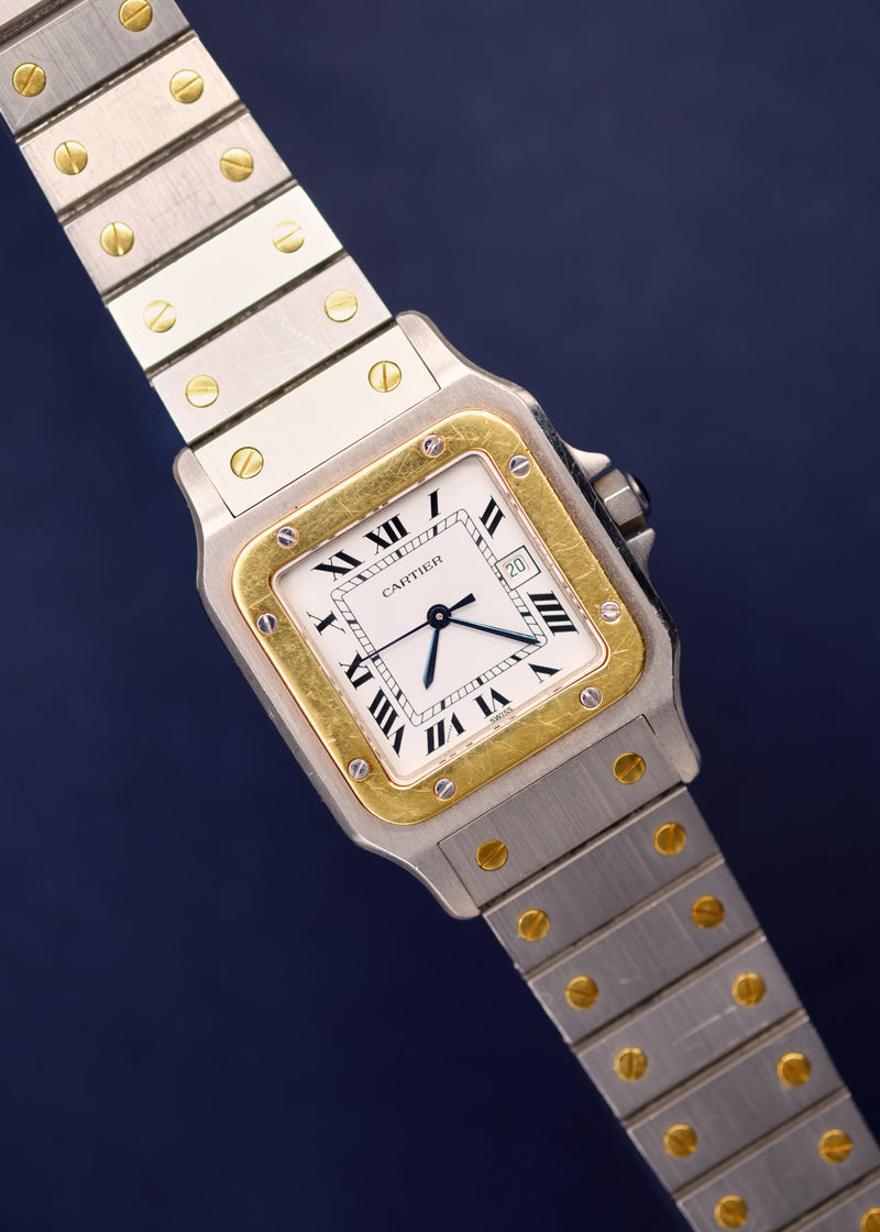 The Cartier Santos Carree features a beautifully crafted dial with Roman numerals and a date function, showcasing Cartier's signature design elements. The two-tone case and bracelet add to its aesthetic appeal, making it a standout piece.