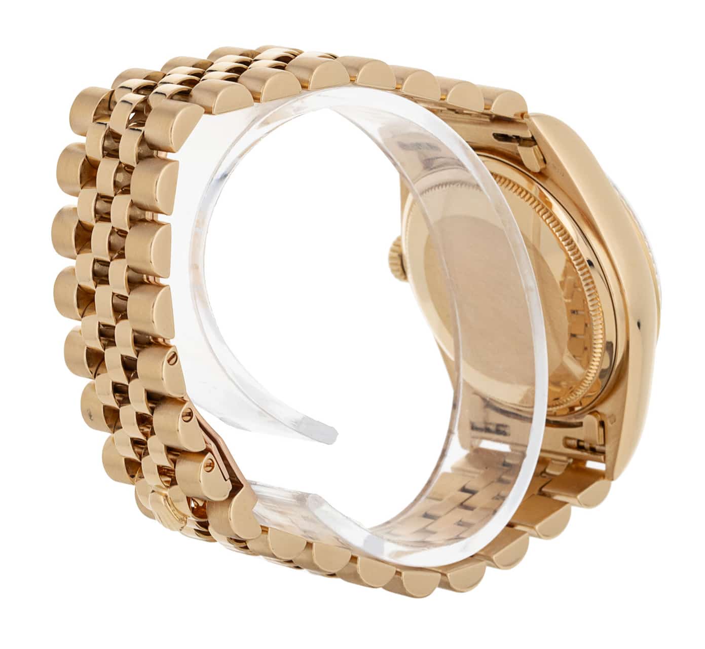 The Rolex Datejust 36 Gold Model 16018 is a quintessential example of a formal/business watch, characterized by its elegant and timeless design. This model is crafted from 18k gold, offering a luxurious appearance that is suitable for formal occasions and professional settings. The Datejust line is renowned for its classic aesthetics and reliable performance, making it a staple in the Rolex collection. This particular model is powered by an automatic movement, specifically the Rolex Caliber 3035, which provides a power reserve of approximately 48 hours. The Datejust 36 is intended for individuals who appreciate classic design and the prestige associated with the Rolex brand. Its appeal lies in its understated elegance and the versatility to transition seamlessly from business attire to more formal events.