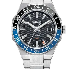 Functional and practical, modern and sporty – the new Citizen Series 8 GMT is the perfect companion from daily wear to spirited travel and everything in-between. The reimagined Citizen Series 8 collection of mechanical watches features elevated designs and high-performance automatic movements with enhanced magnetic resistance to fit every occasion, and this new traveler GMT watch is an impressive addition. Featuring an hour hand which can be independently set, the four-piece case construction defines the design of the brushed and polished silver-tone stainless steel 41mm case that frames the look, with an integrated three-link stainless steel bracelet securing the watch to the wrist and adding a modern sportiness in its wear. A black and blue bi-directional bezel centers the textured black dial with its two-tone 24-hour GMT scale, clicking precisely on each rotation, where a framed date display at the 3 o'clock position provides daily utility, while an orange-tipped hand assists in keeping track of multiple time zones. Water resistant up to 100 metres. Calibre 9054.