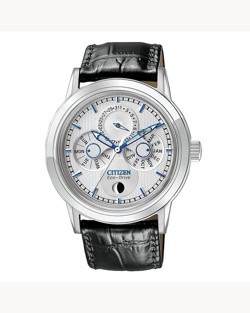 This creates the illusion of motion with its 3 distinctive interlocking subdials. This fun and handsome timepiece features a moon phase indicator, month-day-date and non-reflective spherical crystal. The 41mm stainless steel case sports a silver patterned dial with luminous hands and blue accents, and a black leather strap with buckle. Featuring our Eco-Drive technology – powered by light, any light. Never needs a battery. Caliber number 8730.