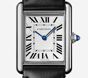 Iconic rectangular stainless steel Tank dress watch powered by solar quartz movement with 16-year autonomy, silver grained dial, black Roman numerals, blued sword hands, and small seconds at 6 o'clock
