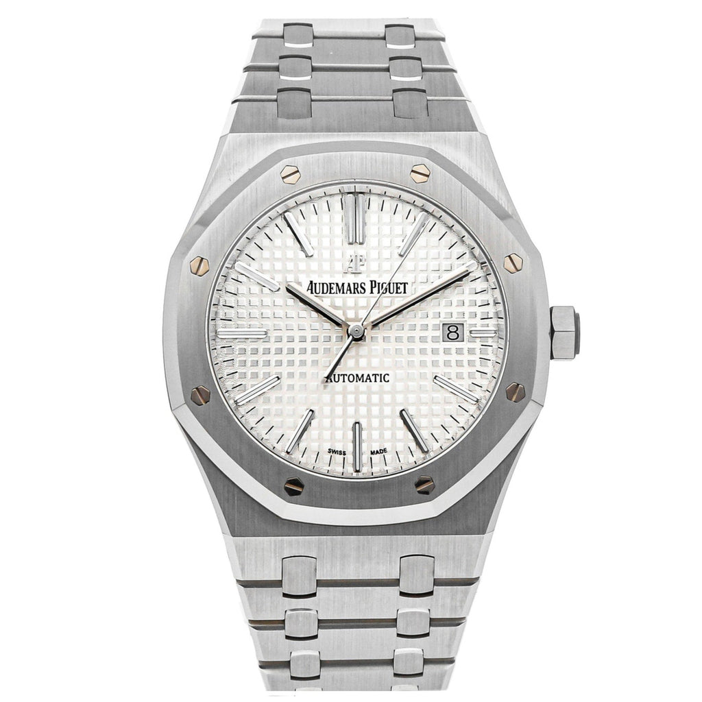 Silver-toned dial with “Grande Tapisserie” pattern, white gold applied hour-markers and Royal Oak hands with luminescent coating