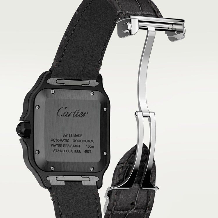 Santos de Cartier watch, large model, Manufacture mechanical movement with automatic winding, caliber 1847 MC. Bezel and case in steel and ADLC, steel crown set with a black faceted synthetic spinel, black dial, black steel sword-shaped hands with luminescent material, sapphire crystal. A rubber strap, second strap in black alligator leather, steel interchangeable deployant buckle. Both bracelets are equipped with the “QuickSwitch” interchangeability system. Case width: 39.8 mm, thickness: 9.38 mm. Water-resistant up to 10 bar (approx. 100 meters/328 feet).