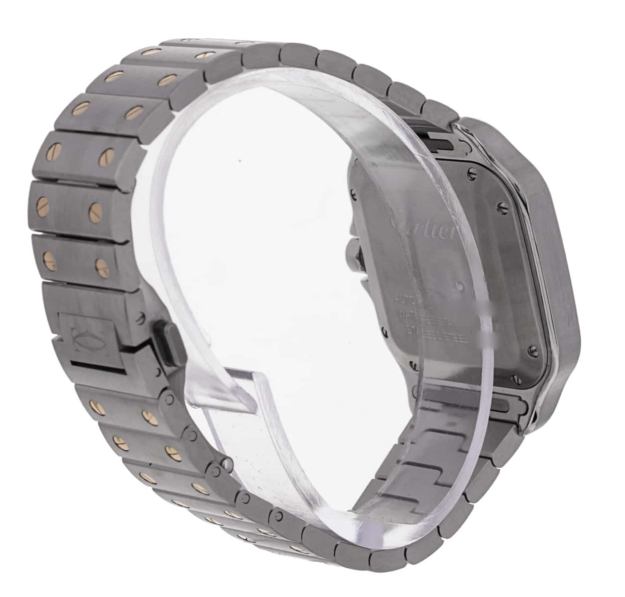 The Cartier Santos features a beautifully crafted dial with Roman numerals and a date function, showcasing Cartier's signature design elements. The two-tone case and bracelet add a luxurious touch, enhancing its visual appeal.