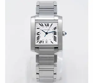 The Cartier Tank Française 2302 is an iconic rectangular dress watch blending Art Deco heritage with modern elegance, featuring a stainless steel case and integrated bracelet, a pristine white dial with Roman numerals and blued sword hands for hours and minutes only, powered by a precise quartz movement offering endless runtime, perfect for the refined professional seeking timeless sophistication without mechanical fuss.