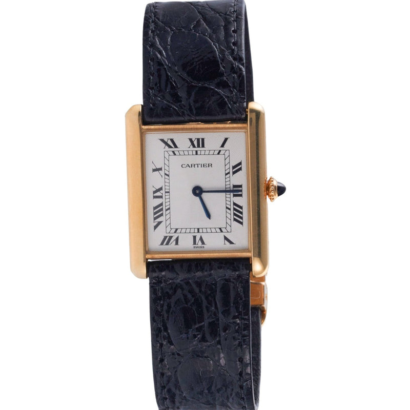 Tank Louis Cartier watch, small model, quartz movement. 18K yellow gold case, beaded crown set with a sapphire cabochon, silver-grained dial, blued-steel sword-shaped hands, mineral crystal, alligator-skin strap 18K yellow gold ardillon buckle. Case dimensions: 29.5 mm x 22 mm, thickness: 6.35 mm. Water-resistant to 30 meters/100 feet.
