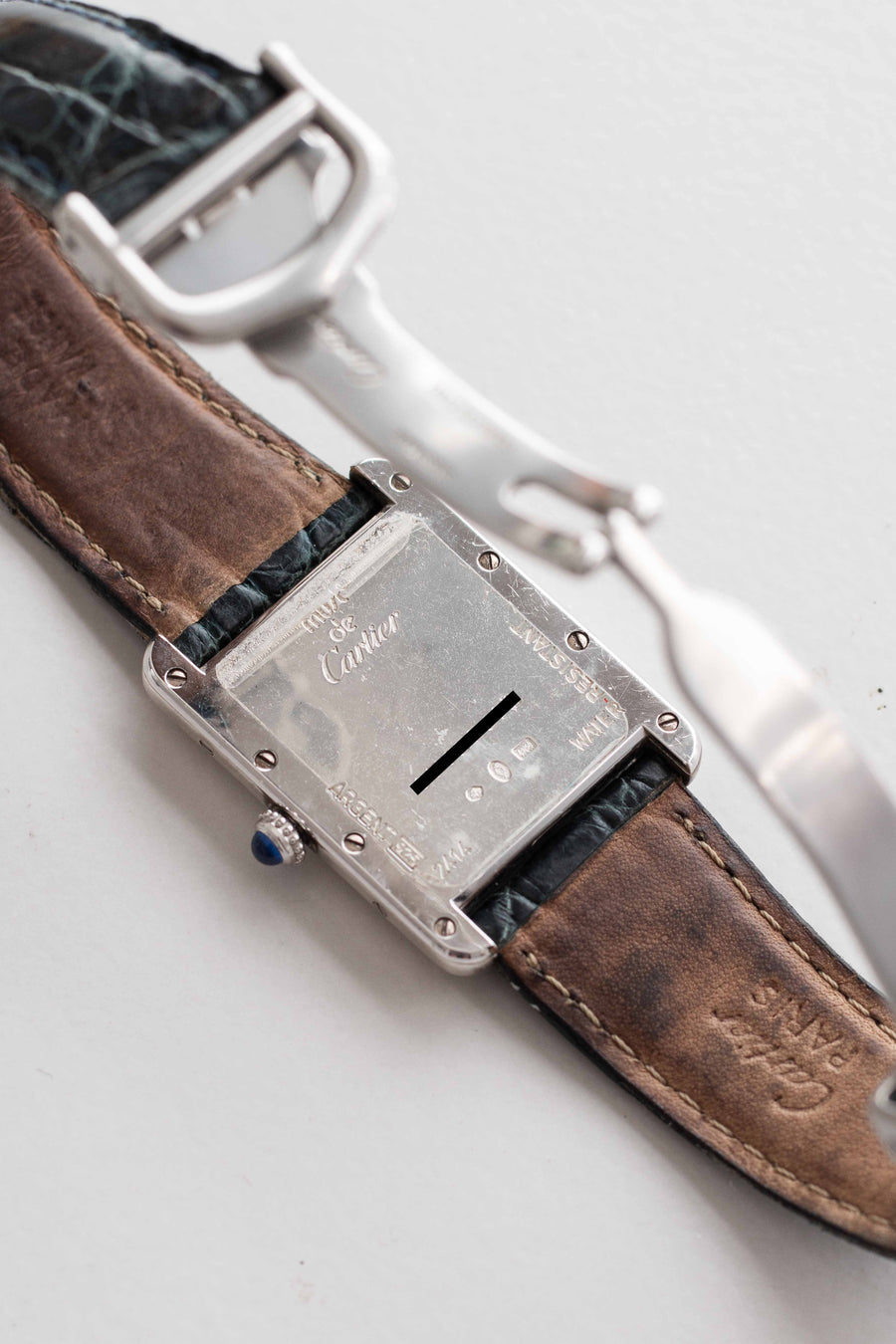 Cartier Must tank designed in solid sterling silver. The watch measures 20 x 28mm, white dial with blue roman numerals, quartz battery movement, and blue sword shape hands.