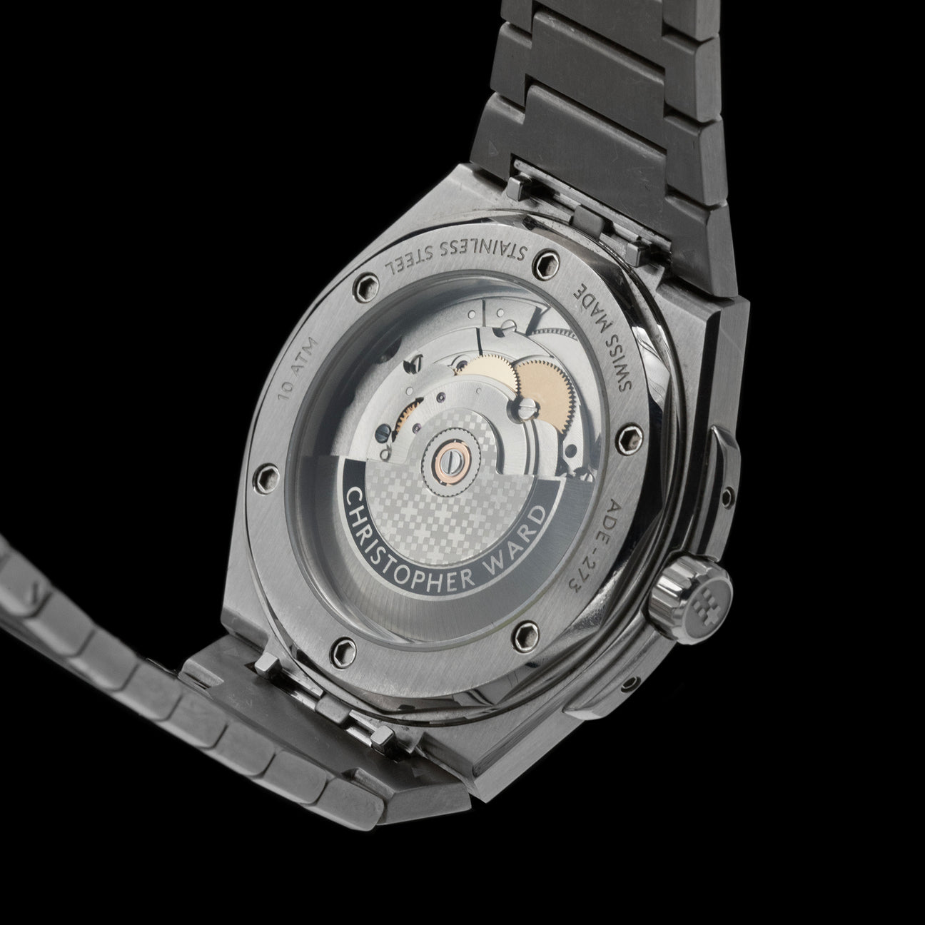Indeed, as you turn The Twelve in your hands, you’ll find intriguing details everywhere. In a playful tip of the hat to the Royal Oak, six exposed screws hold down the 12-sided case-back surround, while Christopher Ward’s sword and triangle handset is rendered in a slim, sophisticated fashion.