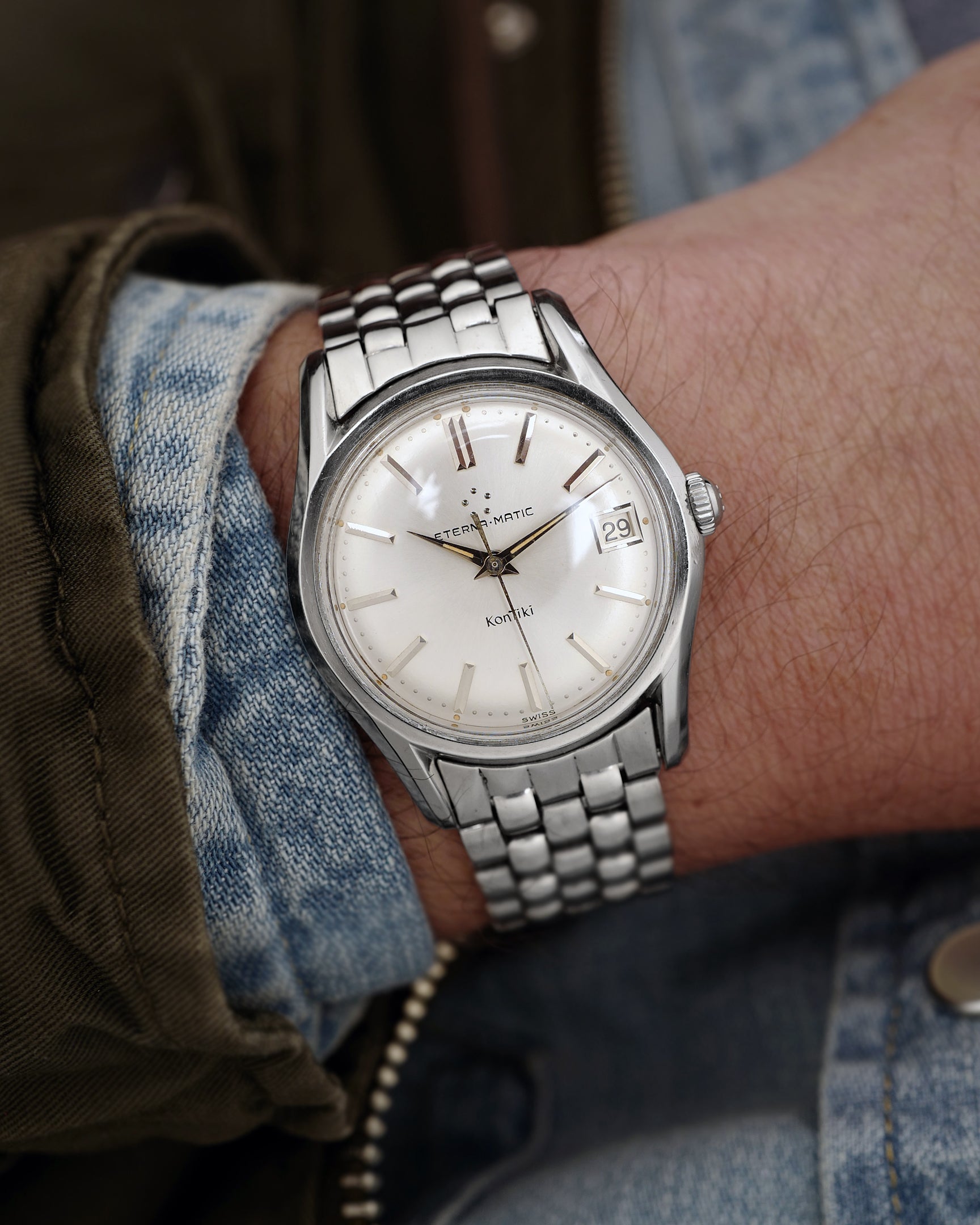 This is a very cool and dressy version of the iconic Eterna Kontiki. The Kontiki was a raft built by Thor Heyerdahl for a scientific voyage, with all crew members wearing Eterna Matic watches – Matic being Eterna’s term for automatic. To celebrate the success of the voyage the Kontiki was launched. This example remains in excellent original condition with lovely bevels on the steel case. The case back has the Thor Heyerdahl Kontiki medal.