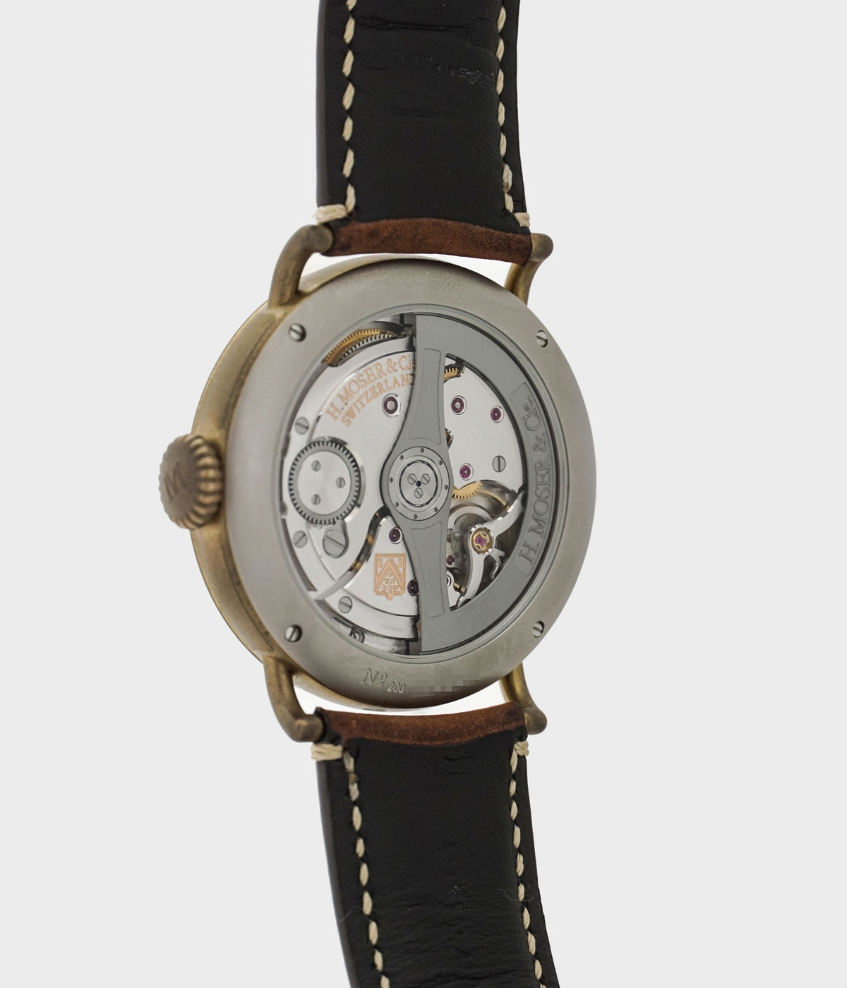 The H. Moser & Cie. Heritage Centre Seconds 8200-1700 is encased in 42mm of Cupro-Aluminum Bronze surrounding a Vantablack dial on a brown kudu strap.