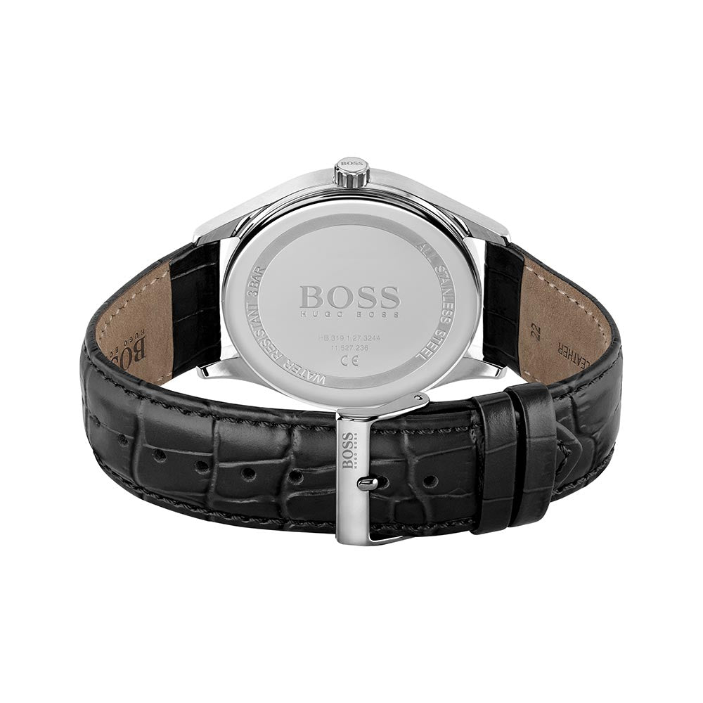 This Hugo Boss watch has a stainless steel case 42mm in diameter and is fitted with a leather strap. Inside the case lies a movement and the watch features a mineral crystal. The watch is 3ATM.