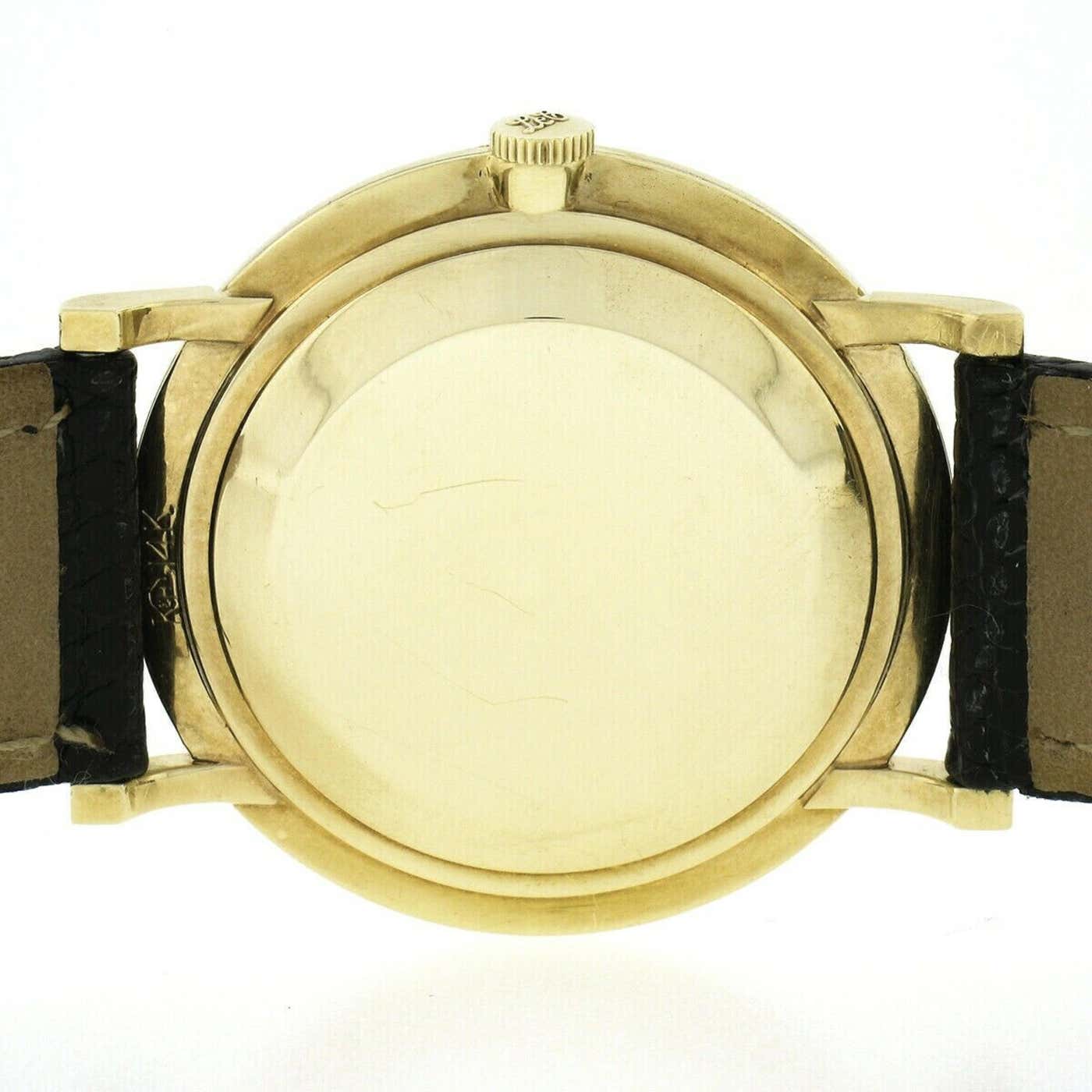 Here we have a gorgeous, vintage, LeCoultre Mystery wrist watch. It features LeCoultre's 17 jewel, manual-winding, caliber 480/CW movement that still keeps accurate time. The 32.3mm round case is crafted from solid 14k yellow gold and has a polished finish. The minute and hour hands are made from natural round cut diamonds which are set in 14k white gold bezels. The 2 piece dial features gold dagger hour markers (with double markers at 12, 3, 6, and 9 o'clock) around the outside and a fluted center piece with a frosted finish and a silver tone. That rotating center piece holds the hour hand and the minute hand is contained in a rotating clear disc that makes it look like it is floating.