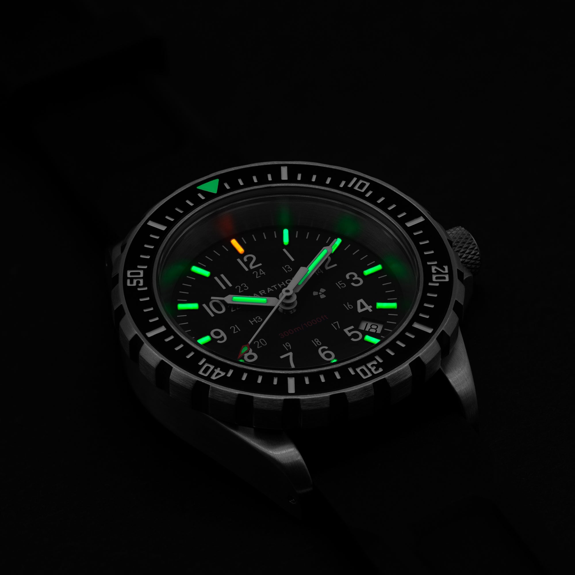Marathon Search and Rescue (SAR) watches were developed to Canadian Government requirements for use in SAR operations. Built to withstand extreme conditions and match the capabilities of the user. First introduced in the early 1990s, they are still in active use today. Overbuilt bezels for manipulation with gloved hands; low-light illumination for use in night missions; screw-in crown and O-ring system for 30ATM water-resistance; high-torque pinions connecting movement to hands; Incabloc™ shock absorbers on all automatic movements. Powered by Swiss-made automatic or quartz movements, the SAR diver’s watches are available in 36mm, 41mm, and 46mm case sizes.
