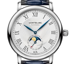 This sophisticated 42mm dress watch embodies classic Montblanc elegance with its opaline silver-white dial, blued feuille hands, rhodium-plated indices, and a standout moonphase complication at 6 o'clock featuring a detailed night sky disc accurate for 122 years, targeting discerning collectors who value formal sophistication and heritage-inspired complications powered by the in-house automatic MB 29.15 movement with a 42-hour power reserve.