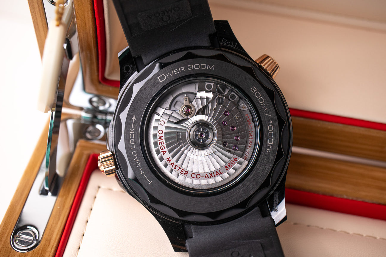 The polished-brushed oriented caseback with wave-edged design features OMEGA’s patented NAIAD LOCK. Powering the watch is OMEGA’s Co-Axial Master Chronometer Calibre 8806.