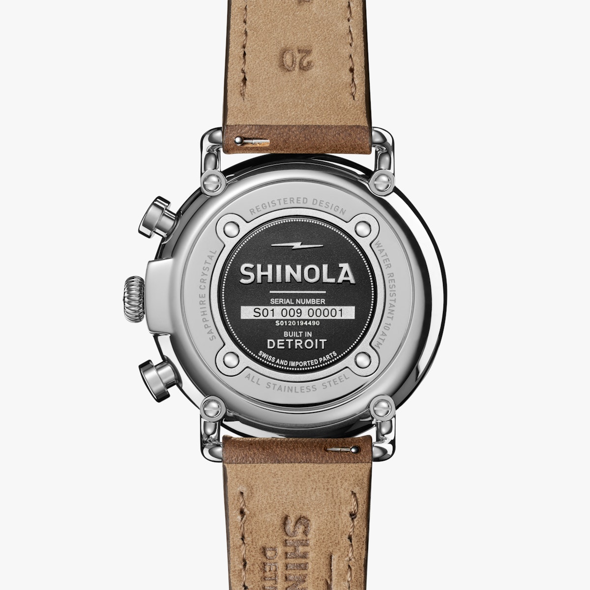 This chronograph combines classic style with versatile function. The 41mm Runwell Chrono features a polished stainless steel case, two sub dials, a calendar aperture, and captivating Super-LumiNova numerals that glow bright blue in the dark, complementing the matte midnight blue matte. Completed with the British tan leather strap, it's a watch you can rely on to keep you on time and up to date in style—from the office to dinner to the weekend.