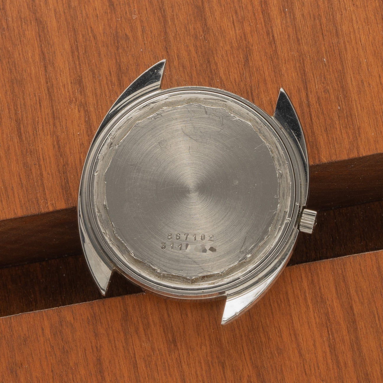 An exceptionally fine timepiece in a Tonneau case, with a beautiful silver dial, fine steel indexes, a date display at three o'clock and black wire hands. The extra magic of this watch lies in its Universal Genève steel bracelet signed by the great manufacturer Gay Frères, dating back to 1969.