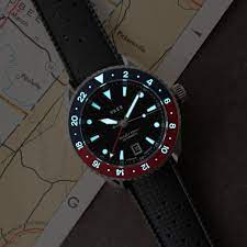 The Vaer G5 Meridian offers a GMT function, enhancing its utility for travelers. It also features a water resistance of 100 meters, suitable for everyday use and light water activities. The lume on the hands and indices ensures readability in low-light conditions.