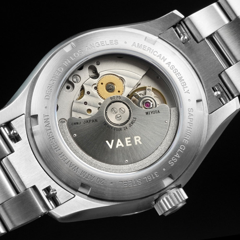 The Vaer G5 Meridian 39mm USA GMT is a versatile timepiece that blends functionality with a classic design, making it suitable for both casual and travel use. This watch is powered by an automatic movement, specifically the Swiss-made ETA 2893-2, known for its reliability and GMT complication, which allows tracking of a second time zone. With a power reserve of approximately 42 hours, it caters to frequent travelers and those who appreciate practical features in a watch. The Vaer G5 Meridian stands out with its robust build, featuring a stainless steel case and a water resistance of up to 100 meters, making it ideal for everyday wear and light water activities. Its appeal lies in its understated elegance and functionality, attracting wearers who value both style and utility.