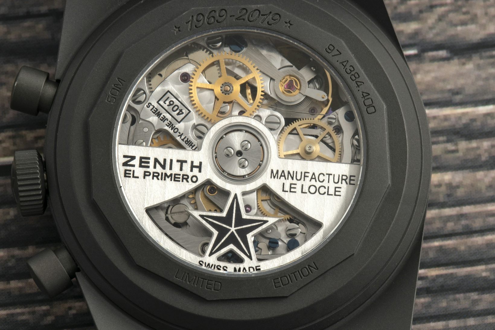 The matte black dial with contrasting sub-dials and applied markers showcases Zenith's attention to detail and design excellence. The overall aesthetic is both bold and refined, making it a standout piece.